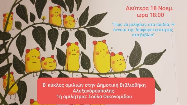 Ξεκινάμε τη Δευτέρα, 18 Νοεμβρίου με την ομιλία της κας Σούλας Οικονομίδου με θέμα: «Πώς να μιλήσεις στα παιδιά; Η έννοια της διαφορετικότητας στα παιδικά βιβλία». Είσοδος Ελεύθερη.