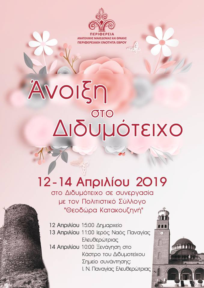 Ένα μουσικοχορευτικό τριήμερο υπό τον τίτλο «Άνοιξη στο Διδυμότειχο» διοργανώνει η Περιφερειακή Ενότητα Έβρου από τις 12 έως και τις 14 Απριλίου 2019, στο Διδυμότειχο, με τη συνεργασία του Πολιτιστικού Συλλόγου «Θεοδώρα Κατακουζηνή» και τη συμμετοχή πολιτιστικών συλλόγων από τον Έβρο, την Περιφέρεια Ανατολικής Μακεδονίας και Θράκης και άλλες περιοχές της Ελλάδας.