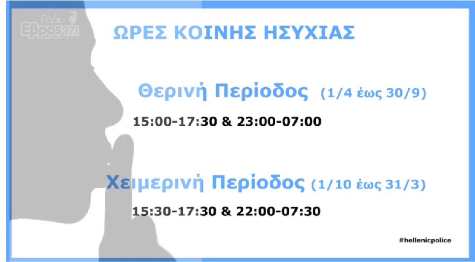 Όπως αναφέρει,κατά τη χειμερινή περίοδο, δηλαδή από την 1η Οκτωβρίου έως την 31η Μαρτίου, οι ώρες κοινής ησυχίας ισχύουν από 15:30 έως 17:30 και από 22:00 έως 07:30.