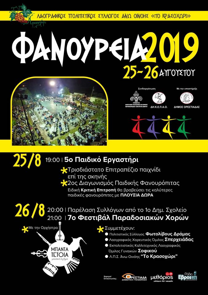 Ο λαογραφικός πολιτιστικός σύλλογος Άνω Οινόης Ορεστιάδας “Το Κρασοχώρι” σας προσκαλεί για ακόμα μια χρονιά στο 7ο φεστιβάλ “Φανούρεια 2019” που λαμβάνει χώρα προς τιμήν του Αγίου Φανουρίου.