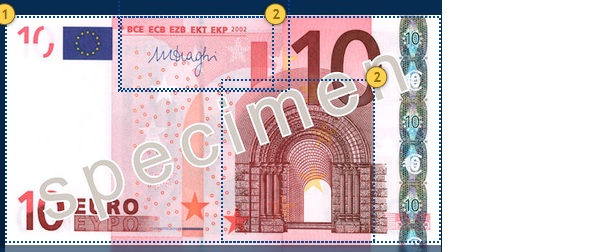 Το ολόγραμμα και το υδατογράφημά του περιέχουν μια προσωπογραφία της Ευρώπης, μίας μορφής της ελληνικής μυθολογίας. Ένα άλλο χαρακτηριστικό είναι ο αριθμός με βαθυπράσινο χρώμα. Όταν το τραπεζογραμμάτιο παρατηρείται υπό γωνία, στον γυαλιστερό αριθμό δημιουργείται μια αίσθηση κίνησης του φωτός από πάνω προς τα κάτω και αντίστροφα. Επίσης, ο αριθμός αλλάζει χρώμα από βαθύ πράσινο σε βαθύ μπλε. Χάρη σε αυτά και άλλα χαρακτηριστικά η γνησιότητα του νέου τραπεζογραμματίου των 10 ευρώ επαληθεύεται πολύ εύκολα με τη μέθοδο των τριών ελέγχων (έλεγχος με την αφή, οπτικός έλεγχος και εξέταση υπό γωνία), αναφέρει η ανακοίνωση της ΕΚΤ.