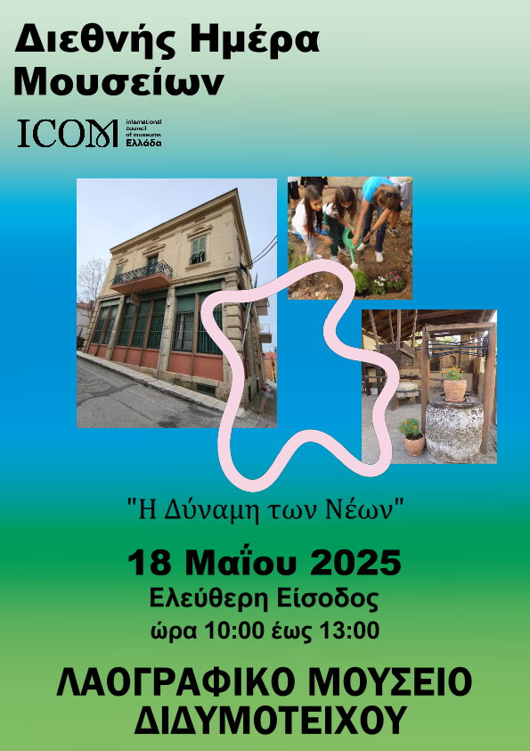 Το Λαογραφικό Μουσείο Διδυμοτείχου, στα πλαίσια της συνεργασίας του με το ICOM (Διεθνές Συμβούλιο Μουσείων), και τιμώντας την επέτειο των Ελευθερίων της πόλης , συμμετέχει στον εορτασμό της Διεθνούς Ημέρας Μουσείων, την Κυριακή 18 Μαΐου 2025, με το προτεινόμενο θέμα “Η Δύναμη των Νέων”.