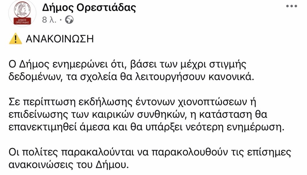 Ακολουθούν οι ανακοινώσεις των Δήμων του Έβρου για τη λειτουργία των σχολείων, για τη Δευτέρα 02.02.2026 – Συνεχής ενημέρωση