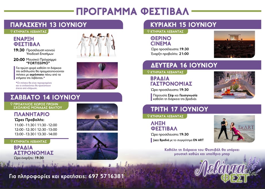 Το Φεστιβάλ που όλοι αγαπήσαμε είναι ξανά κοντά μας. Οι Λεβάντες άνθισαν, τα κτήματα ετοιμάστηκαν και πλέον μένει να κάνεις και εσύ την κράτηση σου για να απολαύσεις αυτό το απίστευτο τοπίο σε ένα πενθήμερο Φεστιβάλ Λεβάντας με πλούσιο πρόγραμμα.