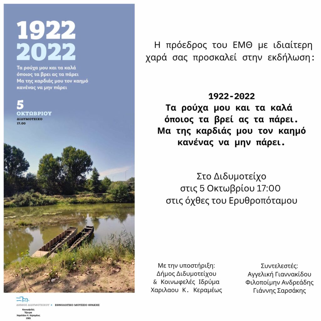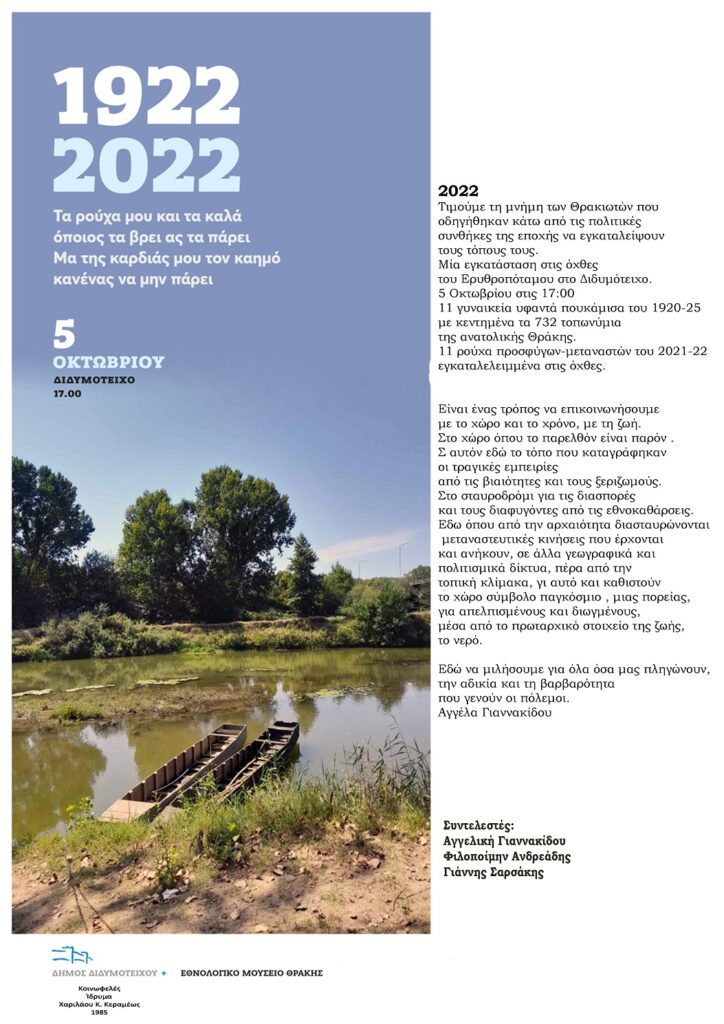Μία ακόμη ευρηματική και πρωτότυπη ιδέα εφαρμόζει το Εθνολογικό Μουσείο Θράκης, έτσι όπως συνηθίζει πάντοτε να κάνει διά της εμψυχώτριάς του Αγγέλας Γιαννακίδου στα 20 χρόνια λειτουργίας του. Αυτή τη φορά στο Διδυμότειχο, στις όχθες του Ερυθροποτάμου, την Τετάρτη 5 Οκτωβρίου και ώρα 5 το απόγευμα, στήνεται ένας ζωντανός συσχετισμός εκατό χρόνων. Ένας αιώνας προσφυγιάς με τις δύο εμβληματικές ημερομηνίες – 1922 και 2022 – το τότε και το τώρα, να ταυτίζονται τόσο. “Εδώ, να μιλήσουμε για όλα όσα μας πληγώνουν, την αδικία και τη βαρβαρότητα που γεννούν οι πόλεμοι“, μάς καλεί όλους η κ. Γιαννακίδου στις όχθες του Ερυθροποτάμου, σ’ ένα χώρο “σύμβολο παγκόσμιο, μιας πορείας, για απελπισμένους και διωγμένους, μέσα από το πρωταρχικό στοιχείο της ζωής, το σύνορο της ζωής και του θανάτου, το νερό”. Πόσο δραματικά αλλά και διαχρονικά επίκαιρη εκδήλωση.