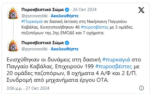 «Χθες το απόγευμα εκδηλώθηκε -από ανθρώπινο χέρι όπως όλα δείχνουν- πυρκαγιά στο Παγγαίο Όρος, η οποία εξελίσσεται έρπουσα, καίγοντας κυρίως ξερά κλαδιά και φύλλα. Μιλάμε για απόκρημνες, δύσβατες χαράδρες και γκρεμούς σε υψόμετρο 1400 μέτρων, όπου επιχειρούν πάνω από 200 δασοκομαντος, ενώ από το πρωί μπήκαν στη μάχη και τα εναέρια μέσα.