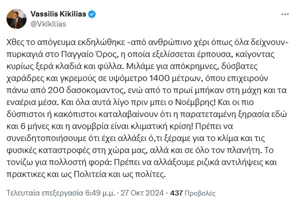 »Μιλάμε για δασική πυρκαγιά λίγο πριν μπει ο Νοέμβρης! Και οι πιο δύσπιστοι ή κακόπιστοι καταλαβαίνουν ότι η παρατεταμένη ξηρασία εδώ και 6 μήνες και η ανομβρία είναι κλιματική κρίση! Πρέπει να συνειδητοποιήσουμε ότι έχει αλλάξει ό,τι ξέραμε για το κλίμα και τις φυσικές καταστροφές στη χώρα μας, αλλά και σε όλο στον πλανήτη. Το τονίζω για πολλοστή φορά: Πρέπει να αλλάξουμε ριζικά αντιλήψεις και πρακτικες και ως Πολιτεία και ως πολίτες», αναφέρει χαρακτηριστικά στην ανάρτησή του ο Υπουργός Κλιματικής Κρίσης και Πολιτικής Προστασίας.