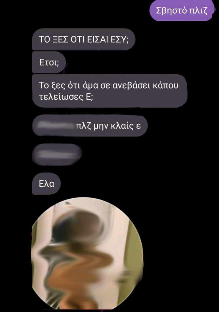 Το τελευταίο συνέβη σε ένα 14χρονο κορίτσι, όταν έλαβε προσωπικό μήνυμα σε μέσο κοινωνικής δικτύωσης με φωτογραφίες που χρησιμοποιεί στο προφίλ της παραποιημένες. Συγκεκριμένα, συμμαθητής της που χρησιμοποίησε σχετική εφαρμογή επεξεργασίας φωτογραφιών, πρόσθεσε το κεφάλι του κοριτσιού σε ξένο γυμνό γυναικείο σώμα, μοιράστηκε τις φωτογραφίες με φίλους και στη συνέχεια άλλος συμμαθητής τις απέστειλε στο κορίτσι, γράφοντας με εκβιαστικό και ειρωνικό τόνο: “Το ξέρεις πως είσαι εσύ έτσι; Το ξέρεις πως αν σε ανεβάσει κάπου τελείωσες, έ;”