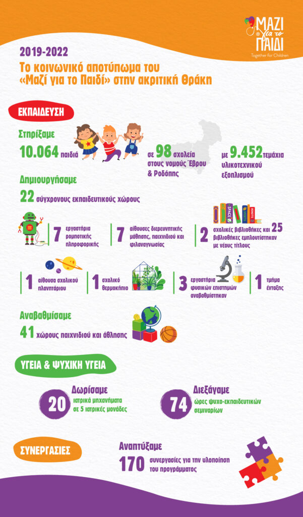 Το «Μαζί για το Παιδί» υλοποίησε στη Θράκη δράσεις ολιστικής παρέμβασης την τετραετία 2019-2022 αγκαλιάζοντας 10.000 μαθητές και τις οικογένειες τους στο πλαίσιο του προγράμματος «Ίσες ευκαιρίες για τα παιδιά: Δράσεις για την Υγεία και την Παιδεία σε ακριτικές περιοχές της Ελλάδας».