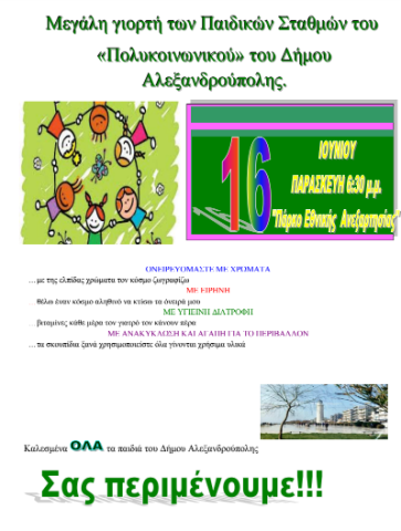 Την Παρασκευή 16 Ιουνίου 2017 στις 18:30, στο πάρκο Εθνικής Ανεξαρτησίας θα πραγματοποιηθεί η μεγάλη γιορτή των Παιδικών Σταθμών του “Πολυκοινωνικού” του Δήμου Αλεξανδρούπολης.