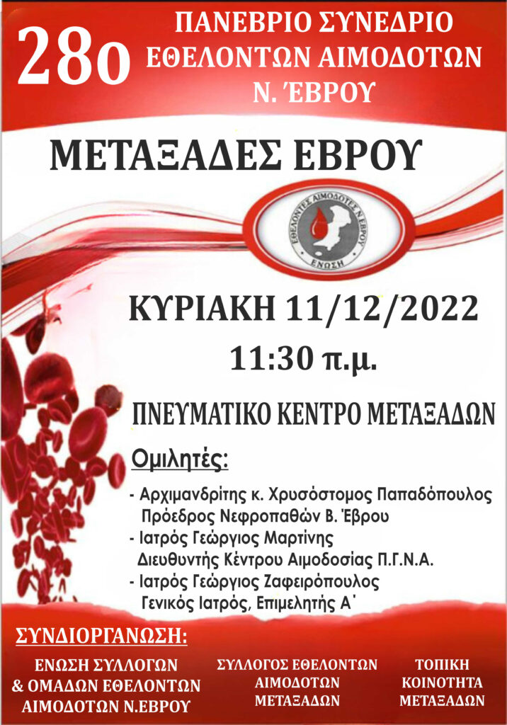 Η Ένωση Συλλόγων & Ομάδων Εθελοντών Αιμοδοτών Ν. Έβρου σε συνεργασία με τον Σύλλογο Εθελοντών Αιμοδοτών Μεταξάδων και την Τοπική Κοινότητα Μεταξάδων, σας προσκαλούν την Κυριακή 11 Δεκεμβρίου 2022 στις 11:30 π.μ. στο 28ο Πανέβριο Συνέδριο Συλλόγων & Ομάδων Εθελοντών Αιμοδοτών Νομού Έβρου, που θα διεξαχθεί στην αίθουσα του Πνευματικού Κέντρου Μεταξάδων Έβρου.