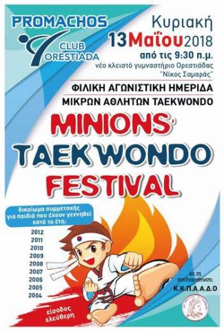 Το “Minions’ Tae Kwon Do Festival” θα πραγματοποιηθεί την Κυριακή 13 Μαΐου 2018 από τις 9.30 το πρωί στο νέο κλειστό γυμναστήριο Ορεστιάδας “Νίκος Σαμαράς”.