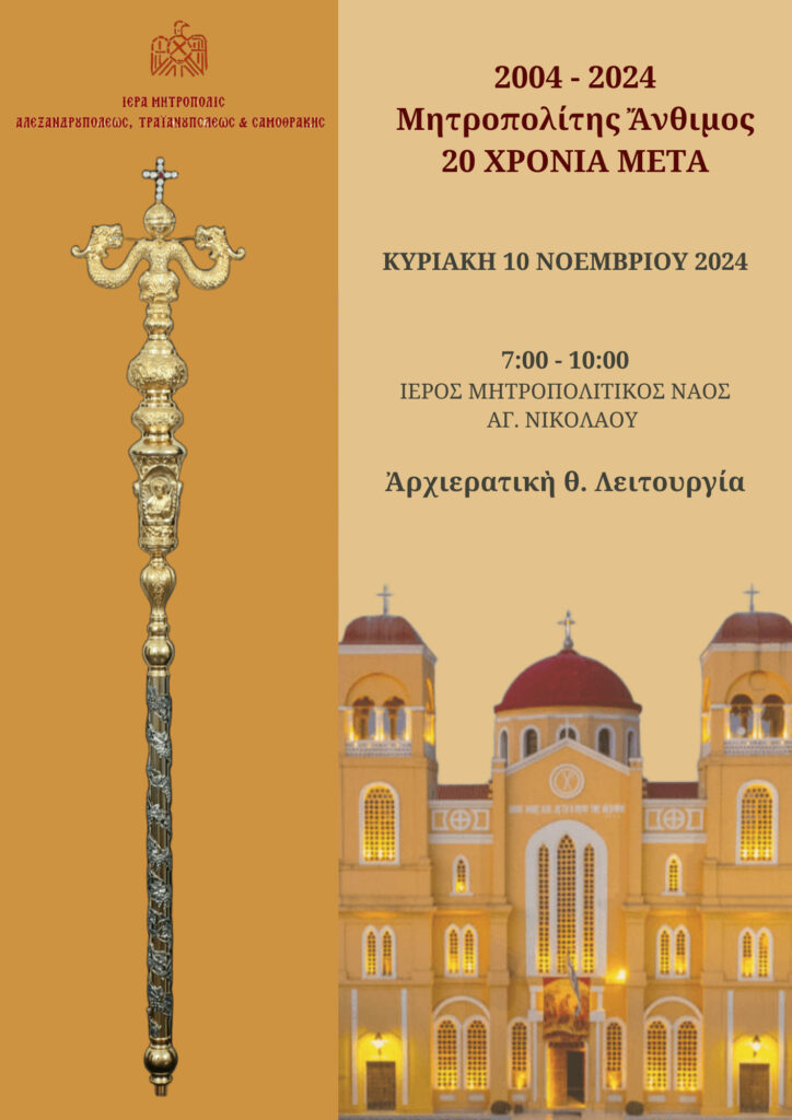 Σας προσκαλούμε όλους στην ευχαριστιακή Θεία Λειτουργία της Κυριακής 10 Νοεμβρίου στον Μητροπολιτικό μας Ναό για να συνενώσουμε τις προσευχές μας και να ευχηθούμε στον Μητροπολίτη μας κ. Άνθιμο, ώστε να τον αξιώνει ο Θεός να ποιμαίνει την Ιερά Μητρόπολη Αλεξανδρουπόλεως μέχρι το τέλος της ζωής του.