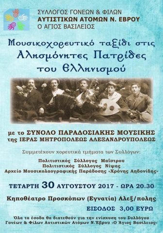 Ο Σύλλογος Γονέων & Φίλων Αυτιστικών Ατόμων Έβρου «Ο Άγιος Βασίλειος» σας προσκαλεί σε ένα “Μουσικοχορευτικό ταξίδι στις Αλησμόνητες Πατρίδες του Ελληνισμού” με το Σύνολο Παραδοσιακής Μουσικής της Ιεράς Μητρόπολης Αλεξανδρούπολης.