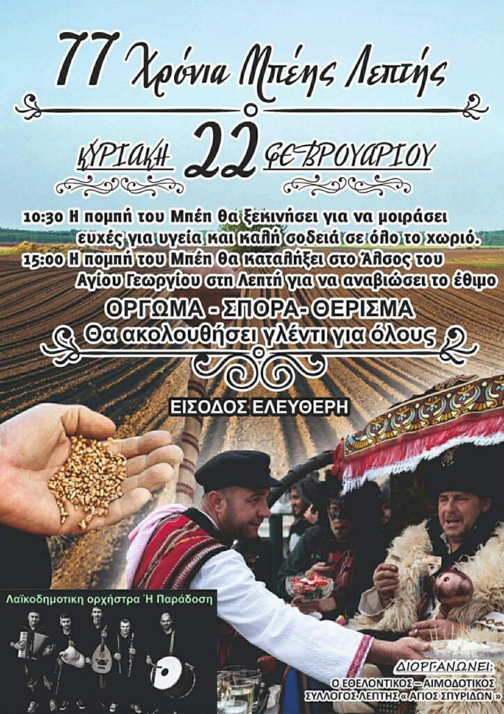 Ο Εθελοντικός – Αιμοδοτικός Σύλλογος Λεπτής “Άγιος Σπυρίδων” διοργανώνει την αναβίωση του εθίμου “Μπέης” στη Λεπτή την Κυριακή 22 Φεβρουαρίου 2026.