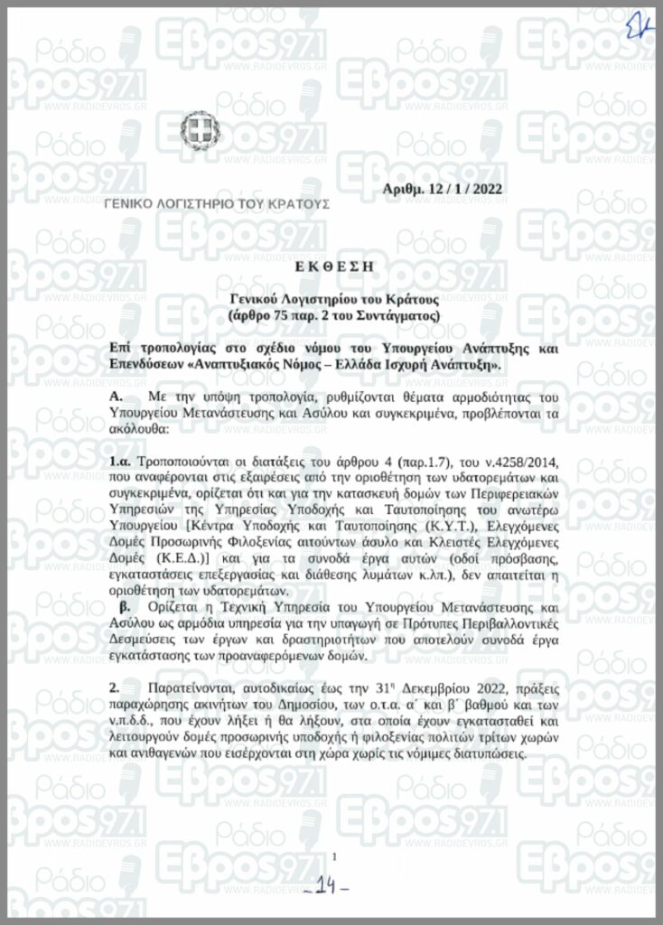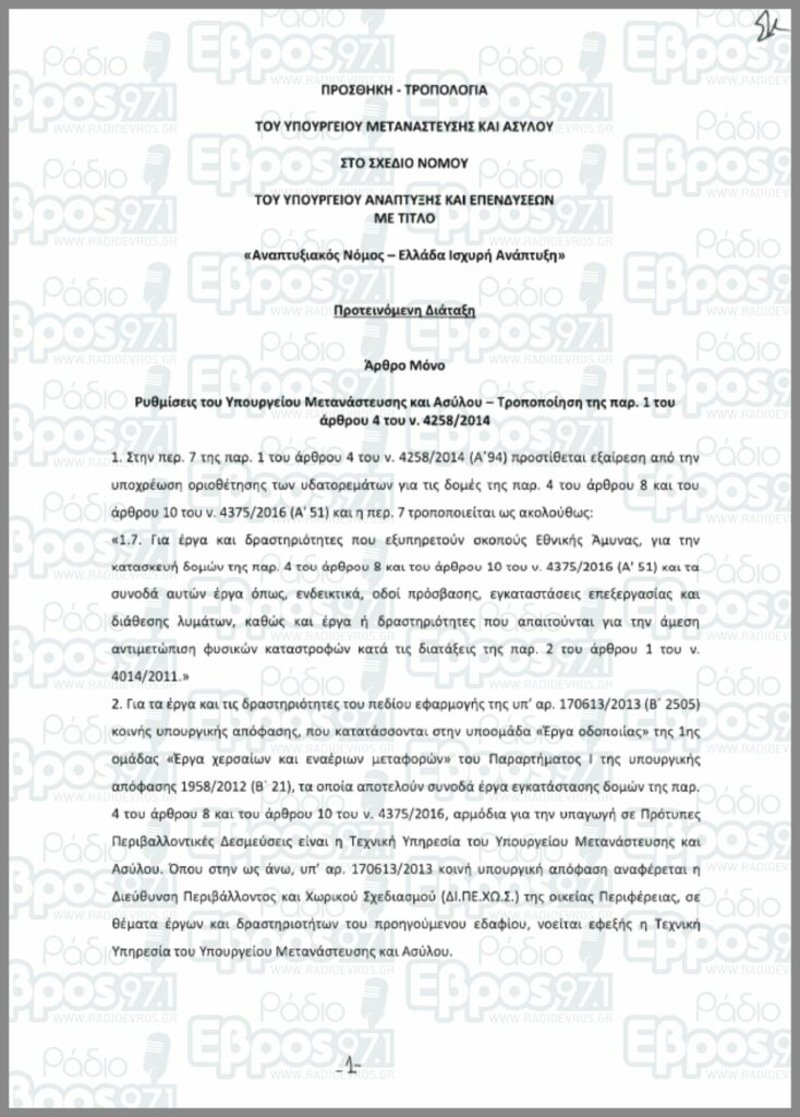 Με μία Προσθήκη – Τροπολογία που αποκαλύπτει το Ράδιο Έβρος και φαίνεται να πέρασε στα… ψιλά, το Υπουργείο Μετανάστευσης και Ασύλου προχώρησε σε ρύθμιση θεμάτων περαιτέρω επιτάχυνσης και διευκόλυνσης των κατασκευών των δομών του, μέσω του νέου Αναπτυξιακού Νόμου που ψηφίστηκε το βράδυ της Τετάρτης στη Βουλή.