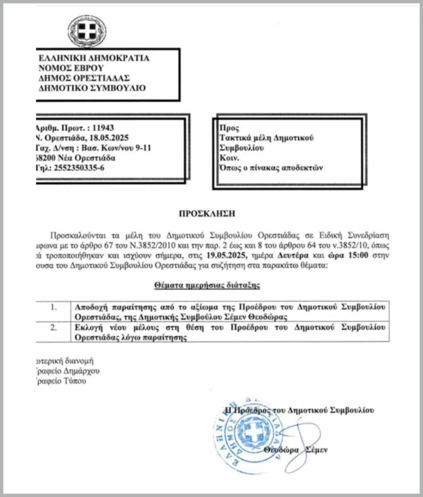 Προσκαλούνται τα μέλη του Δημοτικού Συμβουλίου Ορεστιάδας σε Ειδική Συνεδρίαση σύμφωνα με το άρθρο 67 του Ν.3852/2010 και την παρ. 2 έως και 8 του άρθρου 64 του ν.3852/10, όπως αυτά τροποποιήθηκαν και ισχύουν σήμερα, στις 19.05.2025, ημέρα Δευτέρα και ώρα 15:00 στην αίθουσα του Δημοτικού Συμβουλίου Ορεστιάδα, για συζήτηση στα παρακάτω θέματα: