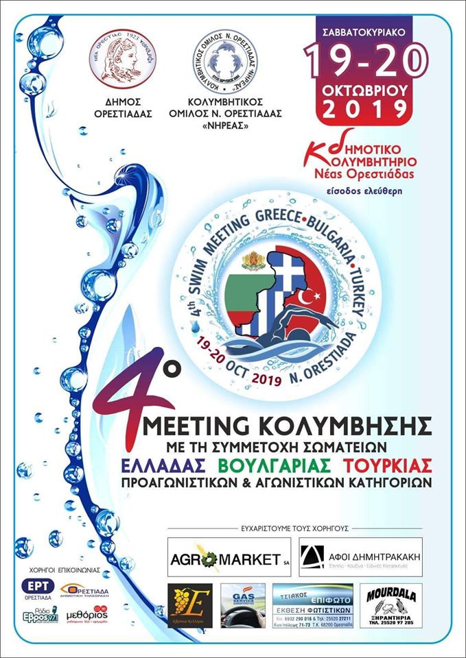Ο Κολυμβητικός Όμιλος Νέας Ορεστιάδας ΝΗΡΕΑΣ σε συνεργασία με τον Δήμο Ορεστιάδας διοργανώνει το Σαββατοκύριακο 19-20/10/2019 το 4ο Τριεθνές Meeting Kολύμβησης στο Δημοτικό Κολυμβητήριο Ορεστιάδας.