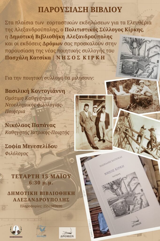 Στα πλαίσια των εορτασμών για τα Ελευθέρια της Αλεξανδρούπολης, ο Πολιτιστικός Σύλλογος Κίρκης, η Δημοτική Βιβλιοθήκη Αλεξανδρούπολης και οι εκδόσεις Δρόμων σας προσκαλούν στην παρουσίαση της ποιητικής συλλογής του Πασχάλη Κατσίκα με τίτλο «Νήσος Κίρκη» που θα λάβει χώρα στη Δημοτική Βιβλιοθήκη Αλεξανδρούπολης την Τετάρτη 15 Μαΐου, στις 6:30 μ.μ.