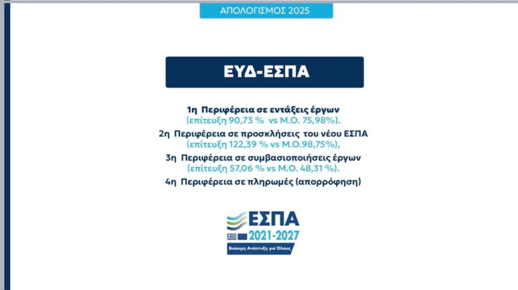 - 2η Περιφέρεια σε προσκλήσεις χρηματοδοτήσεων του νέου ΕΣΠΑ(επίτευξη 122,39 % vs M.O.98,75%),