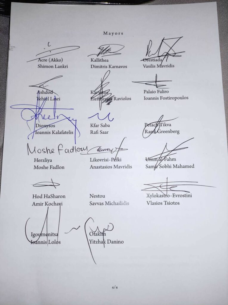 Οι εργασίες της πρώτης μέρας ολοκληρωθήκαν με την υπογραφή από τους Δημάρχους και τους αυτοδιοικητικούς από τις δύο χώρες της Ιδρυτικής Διακήρυξης και του Πρωτοκόλλου σύστασης και δημιουργίας του Δικτύου Πόλεων Ελλάδας και Ισραήλ «Για τον Πολιτισμό και την Υγεία», σε μια λαμπρή τελετή στο ξενοδοχείο «Coral Hotel Athens».