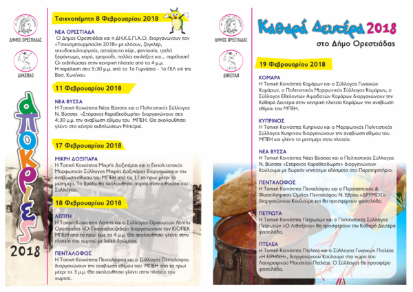 Τσικνοπέμπτη 8 Φεβρουαρίου 2018 ΝΕΑ ΟΡΕΣΤΙΑΔΑ Ο Δήμος Ορεστιάδας και η ΔΗ.Κ.Ε.Π.Α.Ο. διοργανώνουν τον «Τσικνομπουρμπούλη 2018» με κλόουν, ζογκλέρ, ταχυδακτυλουργούς, αστείρευτο κέφι, φαντασία, τρελό ξεφάντωμα, χορό, τραγούδι, πολλές εκπλήξεις και… παρέλαση!