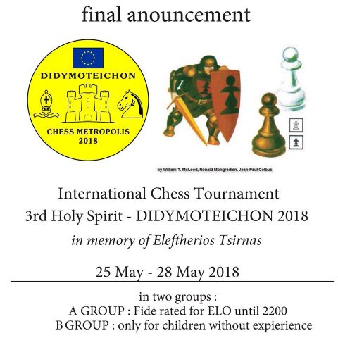 Το 3ο Διεθνές Τουρνουά Σκάκι Διδυμοτείχου “Αγίου Πνεύματος 2018” που διοργανώνει ο Γ.Α.Σ. Σπάρτακος Διδυμοτείχου θα πραγματοποιηθεί στην πόλη του Διδυμοτείχου, στο ξενοδοχείο “Ερμής”, το τριήμερο 25, 26 και 27 Μαΐου 2018 και είναι αφιερωμένο στην μνήμη του εκπαιδευτικού Ελευθέριου Τσίρνα.