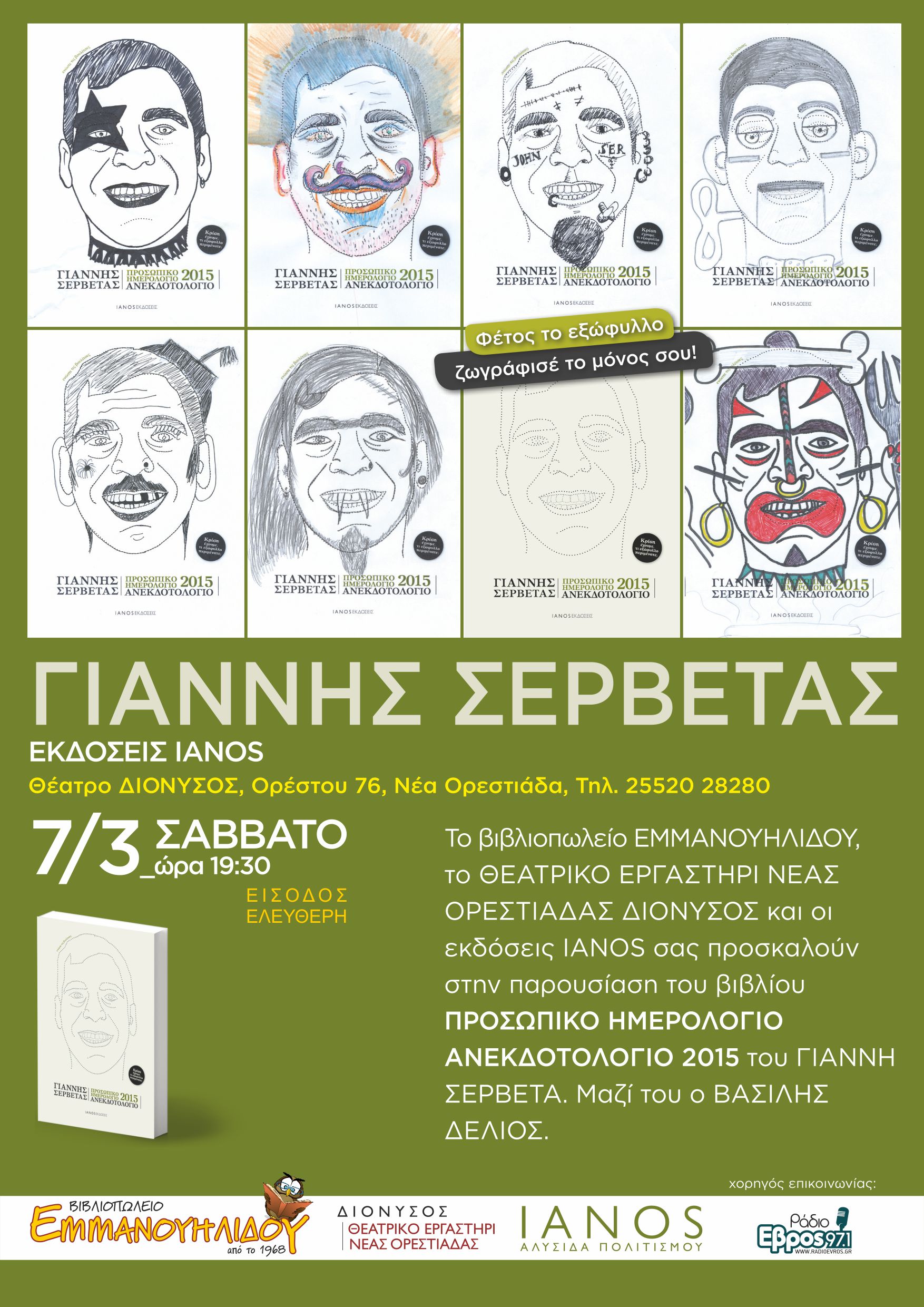 Το Βιβλιοπωλείο «Εμμανουηλίδου», σε συνεργασία με το Θεατρικό Εργαστήρι Νέας Ορεστιάδας ΔΙΟΝΥΣΟΣ και τις Εκδόσεις ΙΑΝΟΣ, παρουσιάζει το Γιάννη Σερβετά, ο οποίος παρουσιάζει το νέο του Προσωπικό Ημερολόγιο Ανεκδοτολόγιο 2015. Μαζί του ο Βασίλης Δέλιος. Είσοδος Ελεύθερη.Χορηγός επικοινωνίας Ράδιο Έβρος