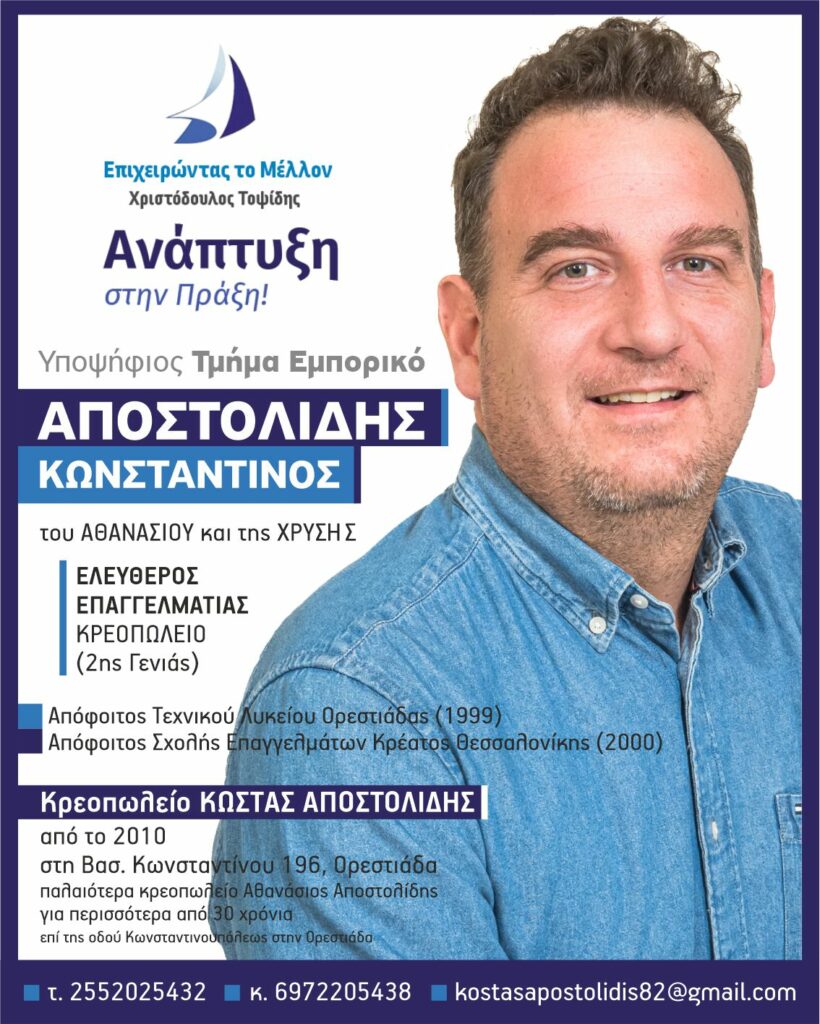 Ο Κώστας Αποστολιδης είναι ελεύθερος επαγγελματίας και διατηρεί το κρεοπωλείο “Ο Κώστας” στη Νέα Ορεστιάδα, από το 2010. Έχει σπουδάσει το αντικείμενο που αγαπά, αποφοιτώντας από τη Σχολή Επαγγελμάτων Κρέατος Θεσσαλονίκης. Είναι κρεοπώλης 2ης γενιάς, συνεχίζοντας την οικογενειακή παράδοση με πίστη στις αξίες του σωστού “επιχειρείν” και πάντα προσηλωμένος στο στόχο του: ποιότητα, αξιοπιστία, ειλικρίνεια. Με αυτά τα αγαθά υπόσχεται ότι θα υπηρετήσει και στο Επιμελητήριο Έβρου, όπως έχει μάθει τόσα χρόνια εξυπηρετώντας τους πελάτες του.