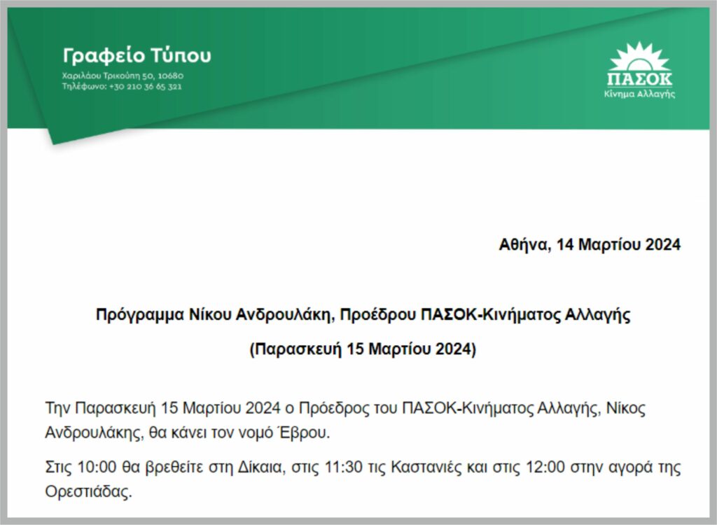 Τον Βόρειο Έβρο επισκέπτεται την Παρασκευή, 15.03.2024, ο Πρόεδρος του ΠΑΣΟΚ – Κινήματος Αλλαγής Νίκος Ανδρουλάκης.