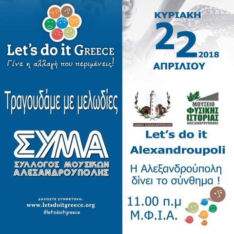 Η Αλεξανδρούπολη γίνεται ο φάρος της περιβαλλοντικής εκστρατείας Let’s do it Greece 2018 την Κυριακή 22 Απριλίου 11.00 π.μ. στο Μουσείο Φυσικής Ιστορίας Αλεξανδρούπολης.