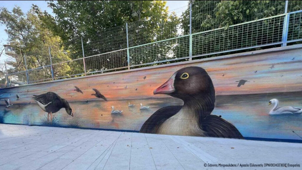 Δύο εντυπωσιακές τοιχογραφίες με πρωταγωνίστρια τη Νανόχηνα, το πιο απειλούμενο υδρόβιο πουλί της Ευρώπης, κοσμούν πλέον τους τοίχους των σχολείων της Αλεξανδρούπολης.