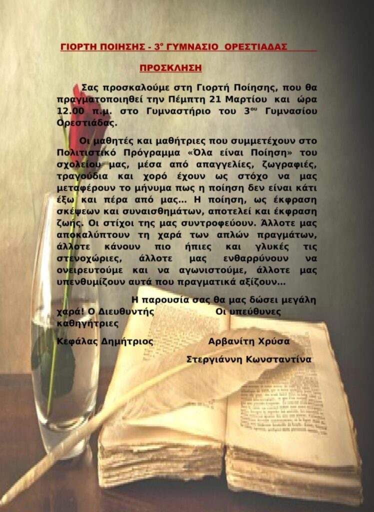 Στο πλαίσιο του Πολιτιστικού Προγράμματος «Όλα είναι Ποίηση» και με αφορμή την Παγκόσμια Ημέρα Ποίησης, την Πέμπτη 21 Μαρτίου 2024 και ώρα 12.00΄ θα πραγματοποιηθεί στο σχολείο μας, το 3ο Γυμνάσιο Ορεστιάδας, Γιορτή Ποίησης.