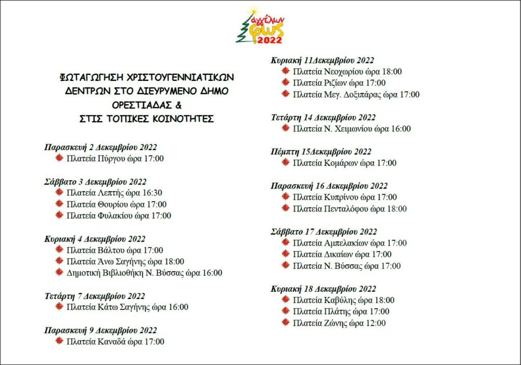 Σημειώνεται πως σύμφωνα με το πρόγραμμα εκδηλώσεων του Δήμου Ορεστιάδας και της ΔΗΚΕΠΑΟ “Αγγέλων Φως 2022” η φωταγώγηση του χριστουγεννιάτικου δέντρου στην πόλη της Ορεστιάδας θα πραγματοποιηθεί το Σάββατο 10 Δεκεμβρίου όπου θα πραγματοποιηθεί και η “Νύχτα των ευχών” στην Κεντρική Πλατεία Ν. Ορεστιάδας.