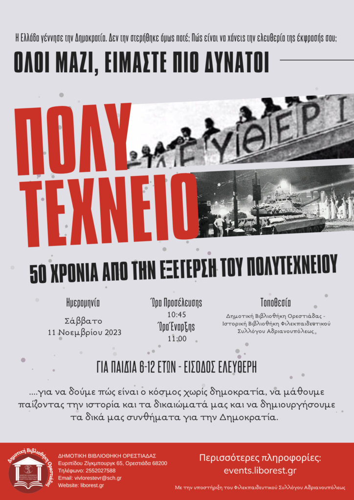 Με αφορμή τα 50 χρόνια από την εξέγερση του Πολυτεχνείου η Δημοτική Βιβλιοθήκη Ορεστιάδας – ΔΗ.Κ.Ε.Π.Α.Ο. προσκαλεί τα παιδιά στην εκδήλωση «Όλοι μαζί, είμαστε πιο δυνατοί»