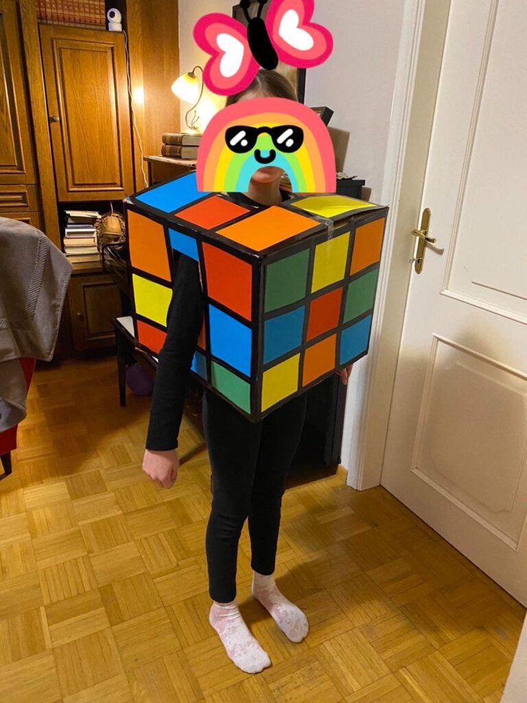 Πολύχρωμα χαρτονένια κουτιά φορεμένα από τους καρναβαλιστές απεικονίζοντας τον γνωστό κύβο του ρούμπικ.