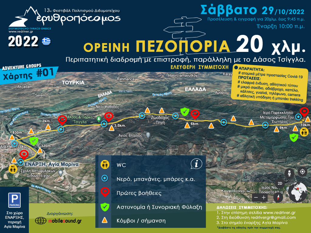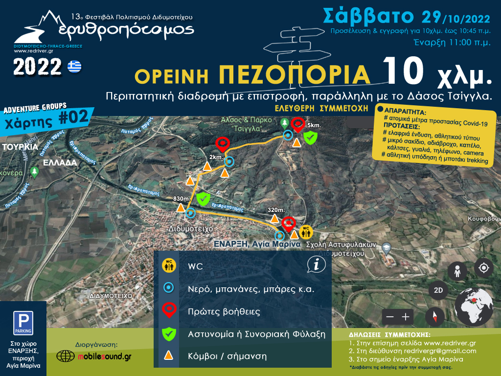 Στο πλαίσιο του 13ου Φεστιβάλ Πολιτισμού Διδυμοτείχου ΕΡΥΘΡΟΠΟΤΑΜΟΣ – REDRIVER 2022, σας προσκαλούμε το πρωί του Σαββάτου 29 Οκτωβρίου να εξερευνήσετε την περιοχή του Διδυμοτείχου κι όχι μόνο. Διοργανώνεται η ορεινή πεζοπορία, μόλις 2 χλμ. από τα σύνορα Ελλάδας και Τουρκίας, με μικρό βαθμό δυσκολίας, χωρίς αγωνιστικό χαρακτήρα και με ελεύθερη συμμετοχή πολιτών, συλλογών ή οργανωμένων group.