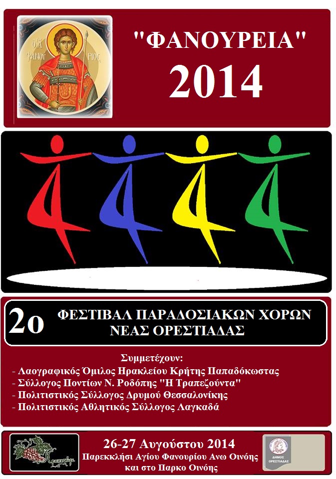Ο Λαογραφικός Πολιτιστικός Σύλλογος Άνω Οινόης Ορεστιάδας «το Κρασοχώρι» σας καλεί στις ετήσιες εκδηλώσεις «Φανούρεια 2014» προς τιμή του Αγίου Φανουρίου, στις 26 και 27 Αυγούστου 2014, καθώς και στο 2ο Φεστιβάλ παραδοσιακών χορών Νέας Ορεστιάδας που θα λάβουν χώρα στο Ιερό Παρεκκλήσιο και το Πάρκο Οινόης (τέρμα Κωνσταντινουπόλεως).