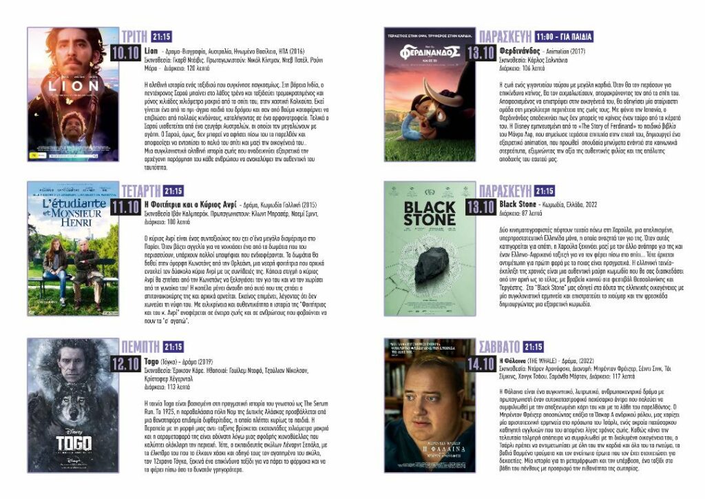 Οι ταινίες θα προβάλλονται κάθε βράδυ από τις 10–14 Οκτωβρίου 2023, στις 9:15 μ.μ. (την Παρασκευή 13/10/20123 θα πραγματοποιηθεί και πρωινή προβολή παιδικής ταινίας για τους μικρούς μας φίλους στις 10:00 π.μ) στο θέατρο «Διόνυσος».