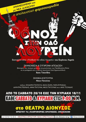 Με την απολαυστική κωμωδία “Φόνος στην οδό Λουρσίν” ξεκινάει τη θεατρική του δραστηριότητα για τη νέα σεζόν το Θεατρικό Εργαστήρι Νέας Ορεστιάδας ΔΙΟΝΥΣΟΣ από αυτό το Σάββατο 20 Οκτωβρίου. Η παράσταση με την οποία ο ΔΙΟΝΥΣΟΣ περιόδευσε το καλοκαίρι στην Αν. Μακεδονία και Θράκη έρχεται ανανεωμένη και με νέα διανομή στη σκηνή του θεάτρου ΔΙΟΝΥΣΟΣ, για να προσφέρει γέλιο, πολύ γέλιο και… σασπένς, κάθε Σαββατοκύριακο μέχρι τις 18 Νοεμβρίου, στις 9 το βράδυ.