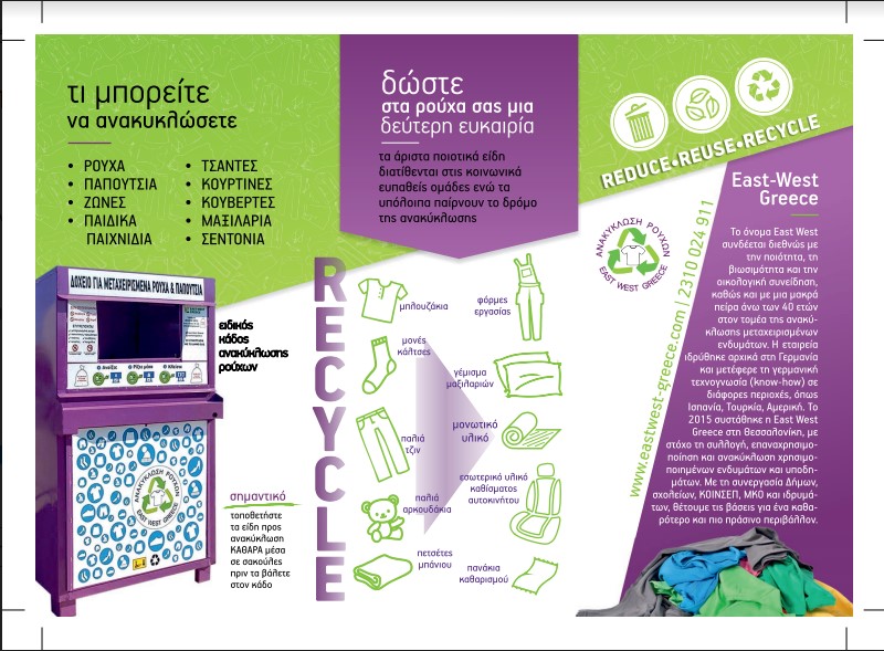 Το ρεύμα της ανακύκλωσης ρούχων, μέσω των μωβ κάδων, υλοποιείται ανεξάρτητα από τη συλλογή ρουχισμού και ειδών πρώτης ανάγκης από το κοινωνικό παντοπωλείο, στο χώρο του Κέντρου Κοινωνικής Προστασίας Αλληλεγγύης και Αθλητισμού του Δήμου Ορεστιάδας.