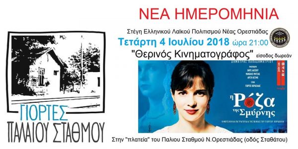 Έπειτα από την αναβολή του “Θερινού κινηματογράφου” λόγω κακοκαιρίας, η προβολή της ταινίας “Η Ρόζα της Σμύρνης” θα πραγματοποιηθεί την Τετάρτη 4 Ιουλίου, στις 21:00, στον ίδιο χώρο (πλ. Παλαιού Σταθμού Ν. Ορεστιάδας).