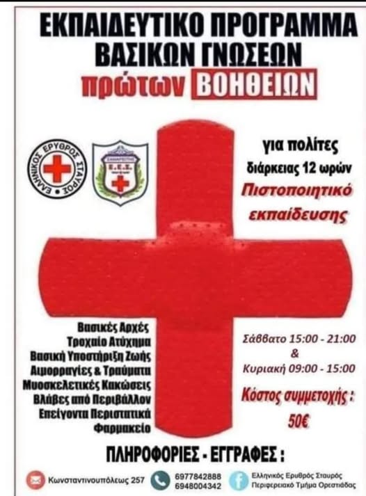 Σεμινάριο στις “Πρώτες Βοήθειες για Πολίτες” διοργανώνει το Τμήμα Ορεστιάδας του Ερυθρού Σταυρού το Σάββατο 25/01/2025 (15:00 έως 21:00) και την Κυριακή 26/01/2025 (09:00 έως 15.00)