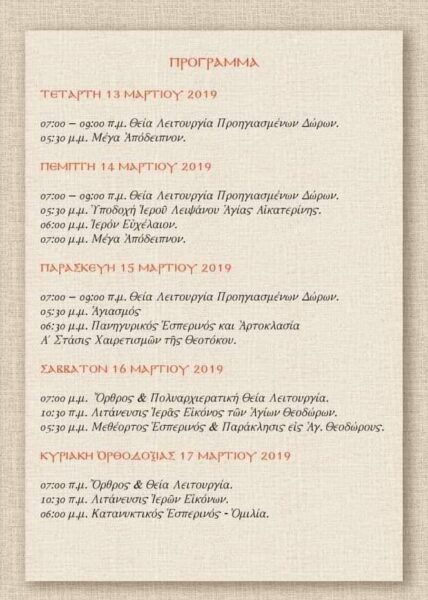 Ο Ιερός Μητροπολιτικός Ναός Αγίων Θεοδώρων Ν. Ορεστιάδος, κατά το διάστημα ημερών 13-17 Μαρτίου 2019, διοργανώνει πανηγυρικές λατρευτικές εκδηλώσεις επί της εορτής του δια κολλύβων θαύματος των Αγίων Θεοδώρων, εφόρων και πολιούχων της πόλεως Νέας Ορεστιάδος, ευλογία και προτροπή του Σεβ. οικείου Ποιμενάρχου, κ. Δαμασκηνού.