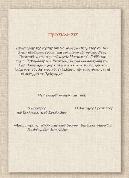 Ο Ιερός Μητροπολιτικός Ναός Αγίων Θεοδώρων Ν. Ορεστιάδος, κατά το διάστημα ημερών 13-17 Μαρτίου 2019, διοργανώνει πανηγυρικές λατρευτικές εκδηλώσεις επί της εορτής του δια κολλύβων θαύματος των Αγίων Θεοδώρων, εφόρων και πολιούχων της πόλεως Νέας Ορεστιάδος, ευλογία και προτροπή του Σεβ. οικείου Ποιμενάρχου, κ. Δαμασκηνού.