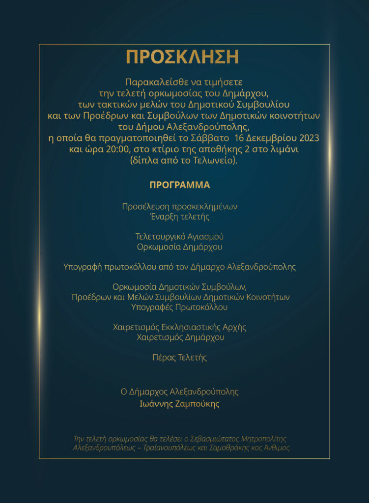 Tο Σάββατο 16 Δεκεμβρίου 2023 και ώρα 20:00 θα γίνει η προβλεπόμενη, από το άρθρο 37 του Ν. 4804/2021, ορκωμοσία του εκλεγέντος Δημάρχου Αλεξανδρούπολης, των τακτικών Μελών του Δημοτικού Συμβουλίου και των Συμβουλίων των Δημοτικών Κοινοτήτων, καθώς και των Προέδρων Δημοτικών Κοινοτήτων στην αποθήκη 2 στο λιμάνι Αλεξανδρούπολης (πλησίον του Τελωνείου).