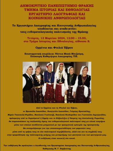 Το Εργαστήριο Λαογραφίας και Κοινωνικής Ανθρωπολογίας υποδέχεται και αναδεικνύει τους ενδυματολογικούς πολιτισμούς της Θράκης – Ορμένιο και Φτελιά Έβρου
