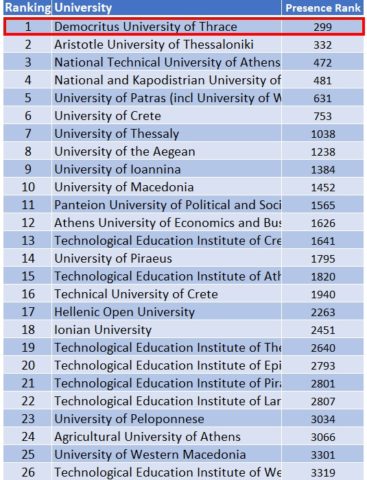 1ο στην Ελλάδα και 299ο στον κόσμο το Δημοκρίτειο Πανεπιστήμιο Θράκης στην κατάταξη με κριτήριο “Presence” σύμφωνα με το Ranking Web of Universities για το 2018