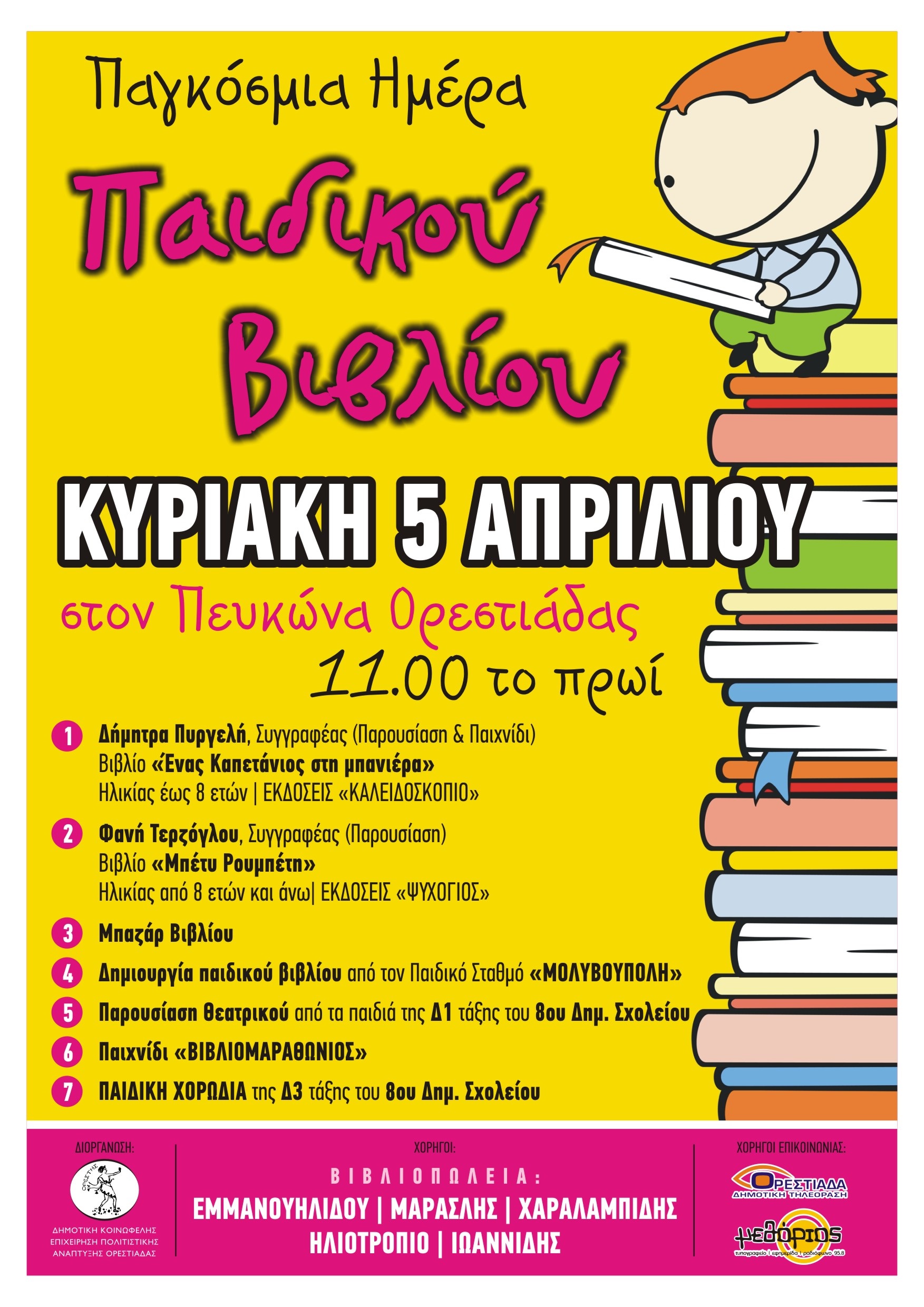 Η Δημοτική Κοινωφελής Επιχείρηση Πολιτιστικής Ανάπτυξης Ορεστιάδας, στο πλαίσιο της Παγκόσμιας Ημέρας Παιδικού Βιβλίου διοργανώνει εκδήλωση την Κυριακή 5 Απριλίου στις 11 το πρωί στον πευκώνα Ορεστιάδας.