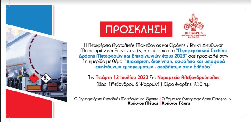 Η ασφάλεια της μεταφοράς και διαχείρισης των επικίνδυνων εμπορευμάτων – αποβλήτων είναι το ζητούμενο της Ημερίδας που διοργανώνεται από την Περιφέρεια Ανατολικής Μακεδονίας & Θράκης / Γενική Διεύθυνση Μεταφορών & Επικοινωνιών με τίτλο «Διαχείριση, διακίνηση, ασφάλεια και μεταφορά επικίνδυνων εμπορευμάτων – αποβλήτων στην Ελλάδα». Η Ημερίδα θα πραγματοποιηθεί στην Αλεξανδρούπολη, την Τετάρτη 12/07/23 στις 09:30 π.μ. στην αίθουσα “Αλέξανδρου Κρίτη” στο Νομαρχείο (3ος όροφος).
